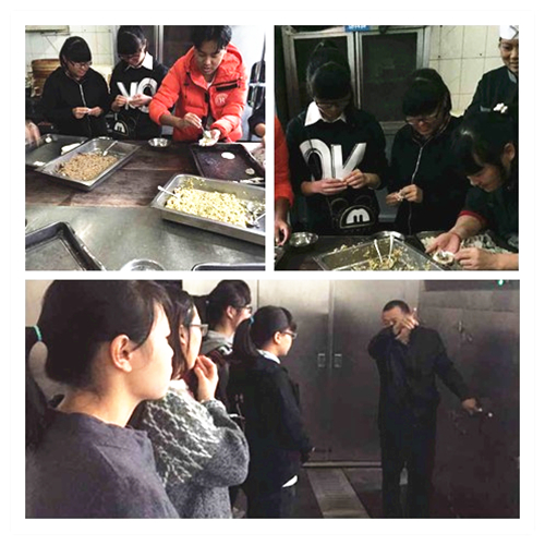 参观结束后,同学们在工作人员的指导下,开始体验食堂各岗位的工作内容:学习切菜、炒菜,积极参与卫生清理等等。参加活动的同学们在厨师的指导下自己制作了菜肴,切菜、上锅、煸炒、调味,忙得不亦乐乎。杭州校园食堂的面点师们还邀请同学一起和面、包饺子。随着前来围观同学们的阵阵赞叹,一道道美味佳肴陆续出锅,当品尝到自己亲手制作的菜肴时,辛福和自豪也满满的写在了大家的脸上。