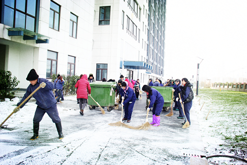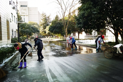 早在周五发布的暴雪黄色预警前,中心就组织两校园各部门召开了抗雪防寒紧急工作会议,提前部署,及早防范。除了加强寒流期间的值班巡逻,及时关注天气变化,还落实了草包、铁锹、工业盐等抗雪物资和餐厅食材、超市货品的检查和准备工作。水电服务部对两校园外露的自来水管、阀门进行认真检查保温,采取了夜间低温时关闭阀门,白天打开阀门以减少极寒低温对水电供应的影响。绍兴校园绿化班组更是提前对行道树做了修剪,防止积雪导致树枝折断、倾倒。中心上下严阵以待,积极应对此次极端天气的来袭。