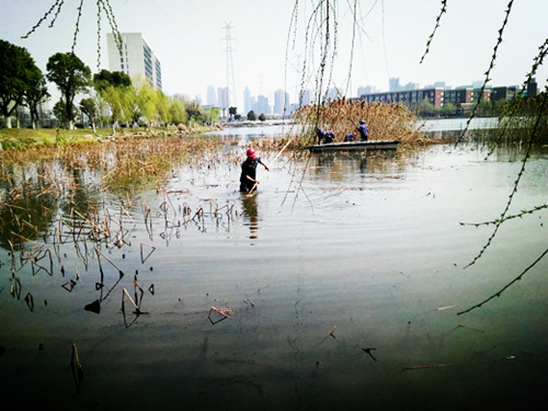 现在的池水依然冷凉,站在水中会使人打寒战。尽管如此,绿化师傅们穿着五六斤重的下水裤,下到没到了大腿的水中,用镰刀把荷叶茎割断,脚底踩在淤泥中,步履艰难地挪动着把枯叶推到岸边,再将一堆堆的断茎残叶装进运送小船,经过了四个多小时的紧张工作,1000平方米荷花池的枯叶已经全部清理完毕。