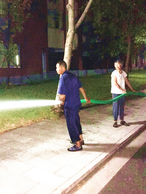 为进一步做好绿化养护工作,确保绿化养护效果,7月26日,中心物业管理部绿化班组对校园绿化进行了补水灌溉工作,尤其是群贤、行健、图书馆、慎思、致知楼周边及早湖沿岸等绿植。今年上半年物业绿化班组对校园的绿化进行了苗木补植,新种苗木在移植过程中由于根系受到损伤,吸水能力差,为确保给苗木成活率,在进行绿化养护作业时做到浇足水、浇透水,在方法上采用根部浇灌和叶面喷洒降温结合,确保了校园绿化环境的美丽整洁。中心主任宋汉卫和物业分管领导钱晓峰更是利用空余时间,与一线员工一起参与绿植灌溉工作,鼓舞了大家的士气。