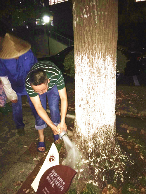 除了做好苗木的补水灌溉工作之外,修剪草坪、修剪树枝、喷洒农药、注射杀虫剂……绿化工们坚持在酷暑下连续劳作好几个小时,虽然已经是汗流浃背,但大家没有丝毫的懈怠,努力做好分内工作,只为给校园的夏季苗木养护工作贡献自己的微薄之力。(中心办公室供稿)